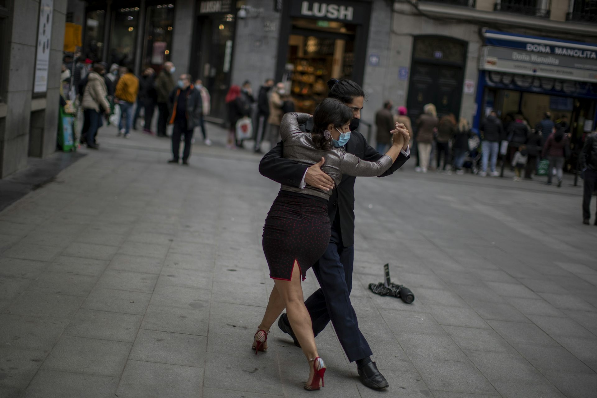 Street dancers wearing face masks dance the tango in Madrid, Spain, Dec. 16, 2020.