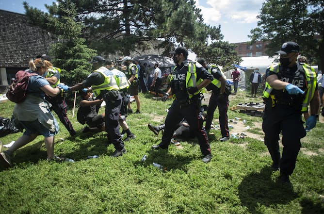 A new law will erode public oversight into police misconduct. In this July 2021 photo, police are seen clearing a homeless encampment in Toronto.