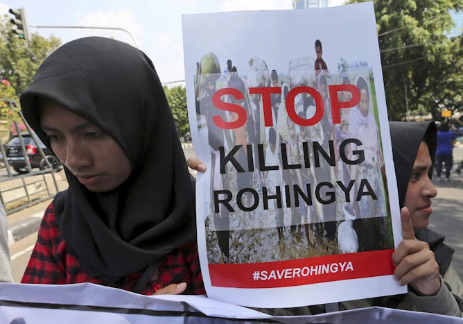 Women display a poster during a rally against the persecution of Rohingya Muslims outside the Myanmar embassy in Jakarta, Indonesia.