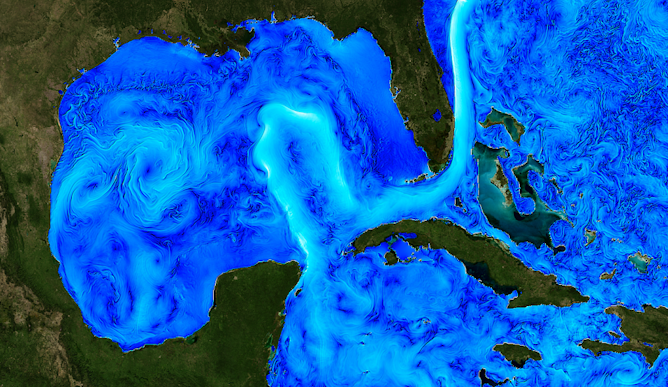 An image from satellite data shows the strong Loop Current and swirling eddies.