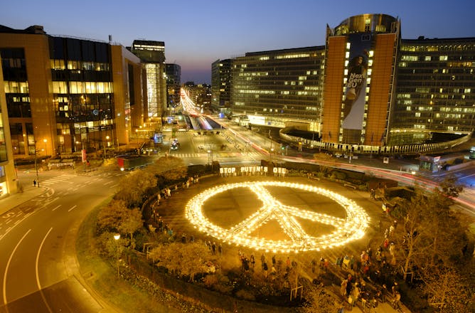 Peace activists demonstrate outside the European Commission building on March 22, 2022, in Brussels.