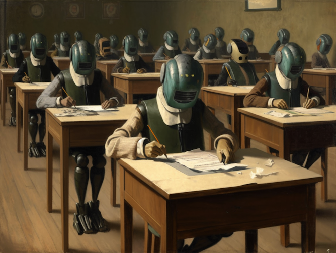 Image générée par la version 5 de Midjourney avec la commande suivante: «Robots en examen, plume à la main, à la manière de Camille Corot.»