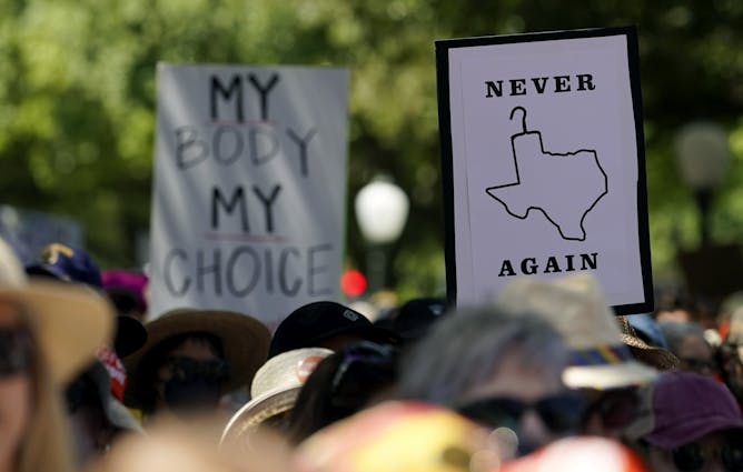 Abortion rights demonstrators hold signs during a rally at the Texas Capitol in May 2022. The state has the most extreme anti-abortion laws in the U.S., and Mexican abortion referral services are now helping American women who require abortions.
