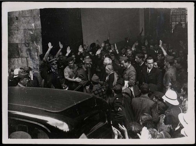 El General Millán Astray, Miguel de Unamuno, el Cardenal Pla y Deniel y Carmen Polo de Franco se despiden a las puertas de la Universidad de Salamanca tras el acto de celebración del denominado ‘Día de la Raza’ el 12 de octubre de 1936 en el paraninfo, acto presidido por Unamuno.