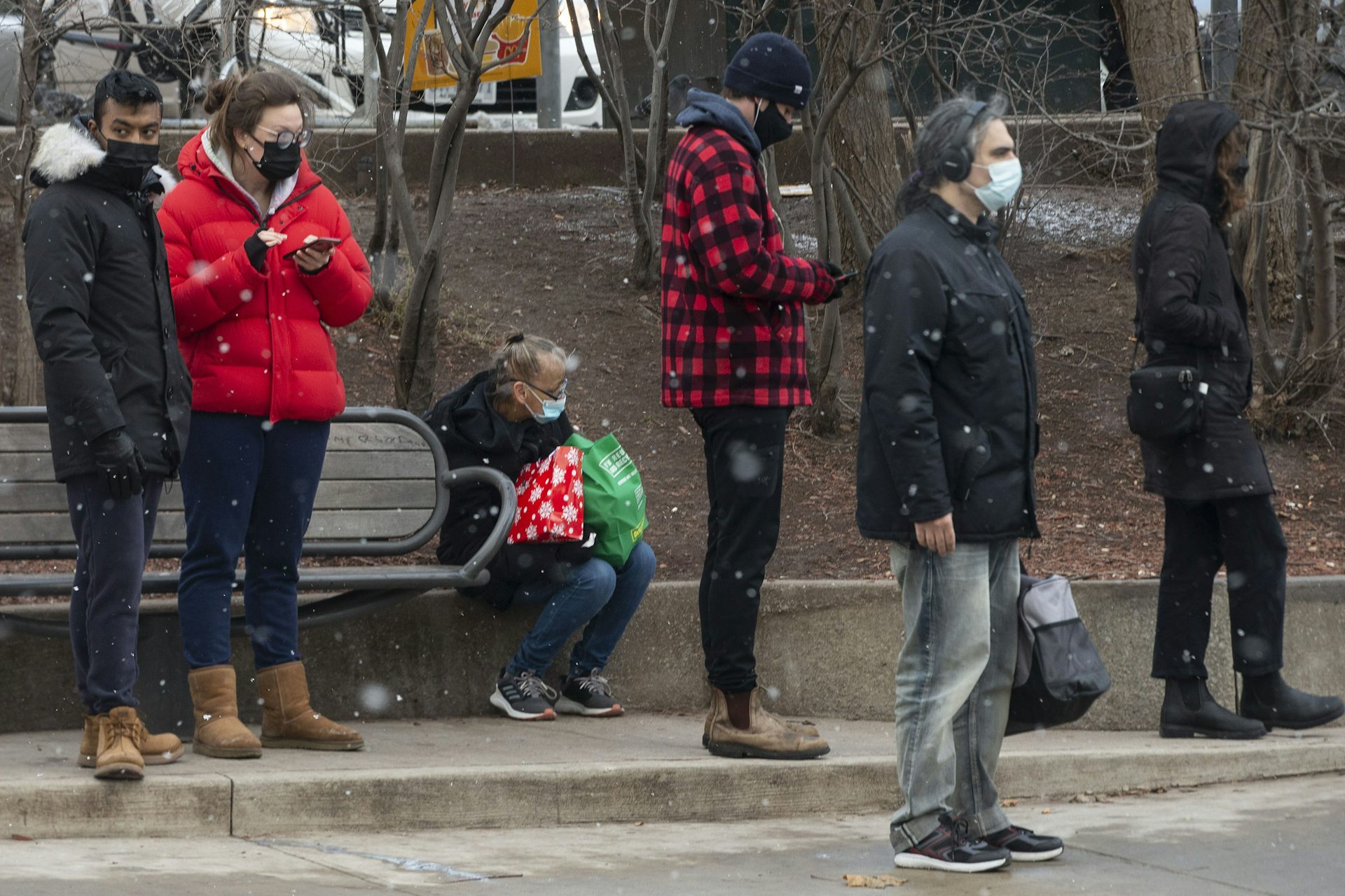 People wait in line — some for over two hours — at a PCR COVID-19 test site in Toronto.