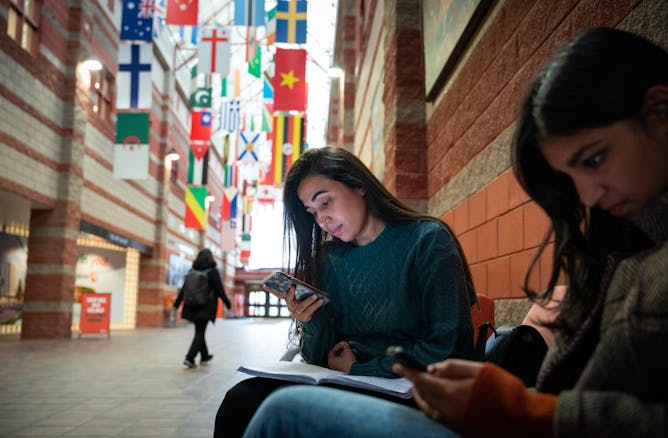 Cape Breton University first-year public health students, both from India, sit in the university’s great hall in Sydney, N.S., in October 2023.