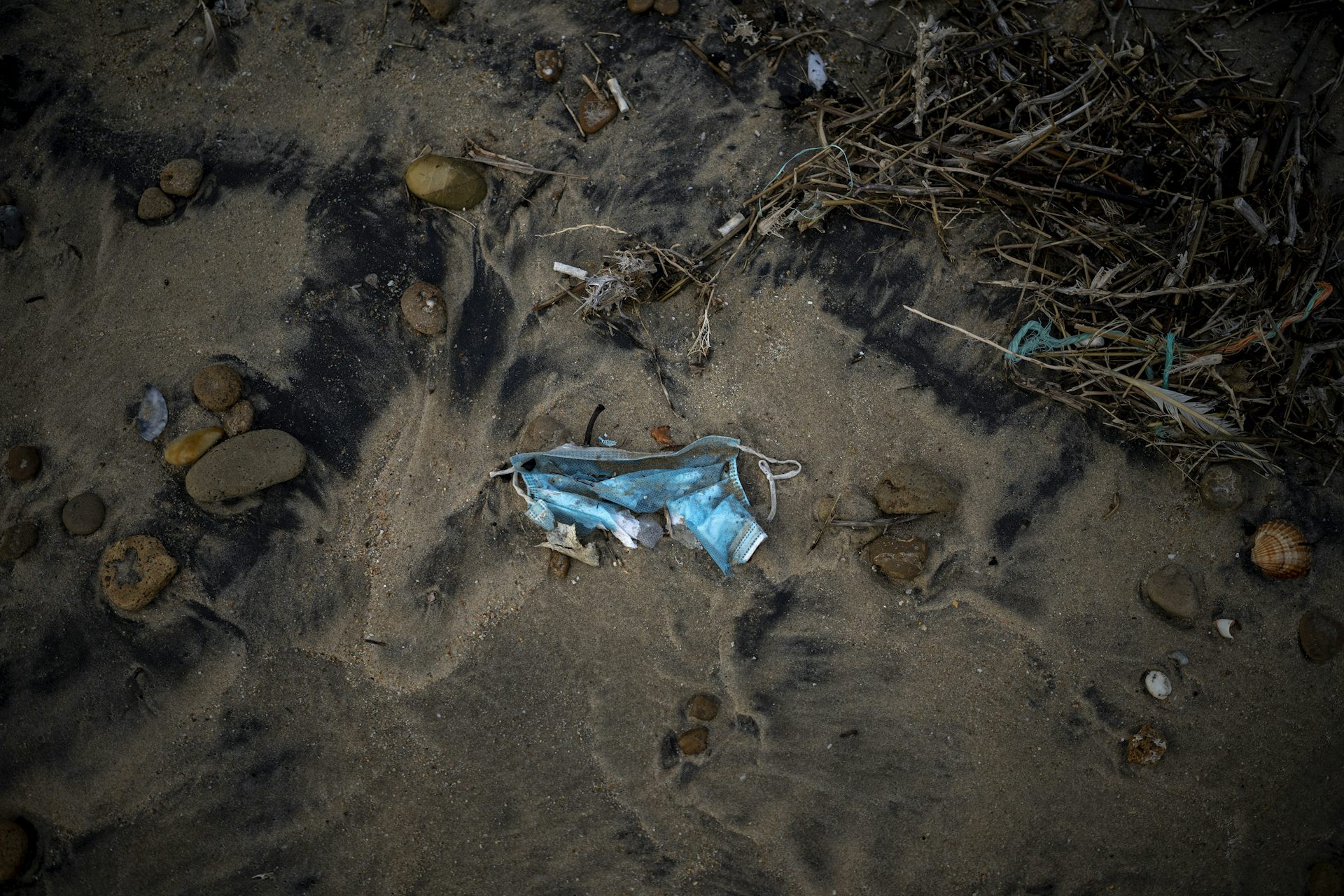 Un masque de protection, utilisé comme mesure préventive contre la Covid-19, gît sur le sol d'une plage près de Barbate, dans la province de Cadix, au sud de l'Espagne, en février 2022.