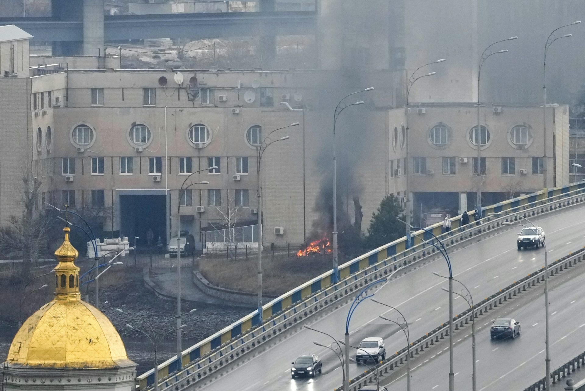 De la fumée et des flammes s’élèvent près d’un bâtiment militaire après une frappe russe, à Kiev, en Ukraine, le 24 février 2022.