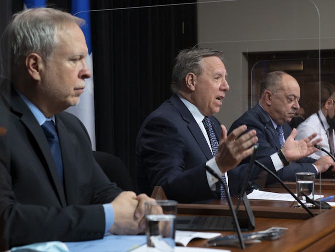 Le premier ministre du Québec, François Legault, annonce un allègement des mesures sanitaires, le 8 février, à Québec, en compagnie du directeur par interim de la Santé publique, Luc Boileau, et du ministre de la Santé, Christian Dubé.