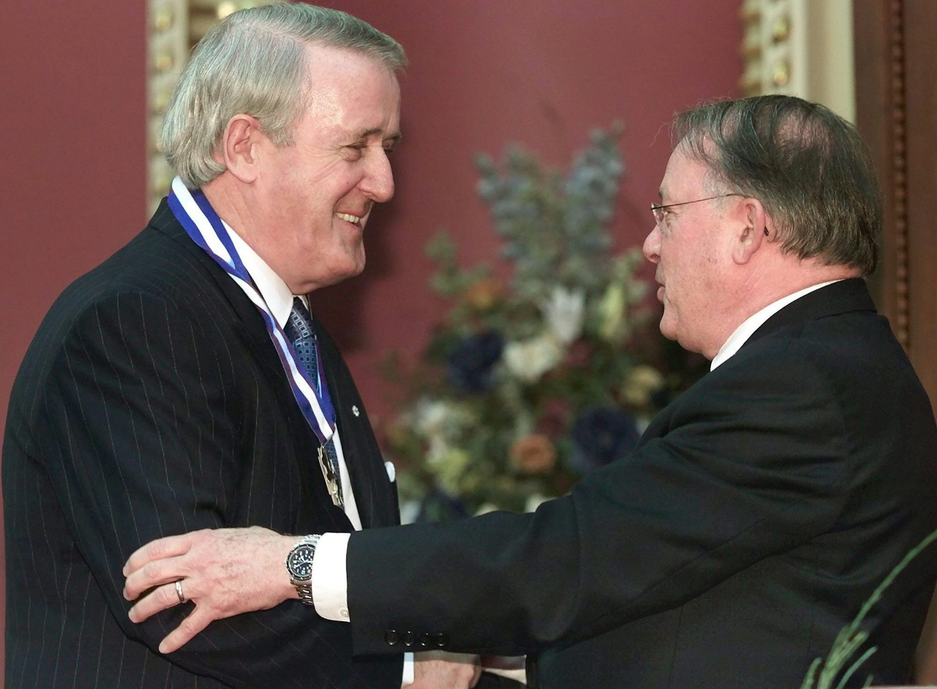 Former prime minister Brian Mulroney receives the National Order of Québec from Québec Premier Bernard Landry in May 2002 during a ceremony at the Québec legislature.
