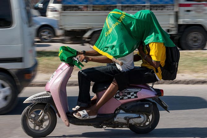 Supporters of ruling party Chama Cha Mapinduzi (CCM - Party of the Revolution) drive with the party’s flag on their heads on a motorcycle.