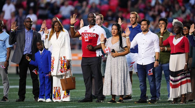 New Canadians take the Oath of Citizenship during halftime at a Redblacks and Montréal Alouettes CFL game in Ottawa in July 2022.
