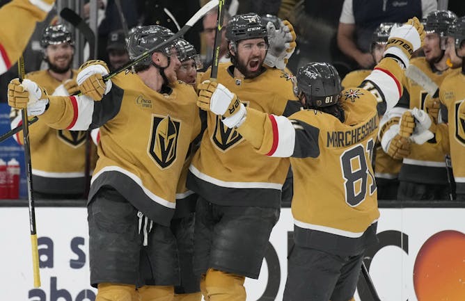 Vegas Golden Knights defenseman Nicolas Hague celebrates after scoring against the Edmonton Oilers during Game 5 of an NHL hockey Stanley Cup second-round playoff series on May 12 in Las Vegas.