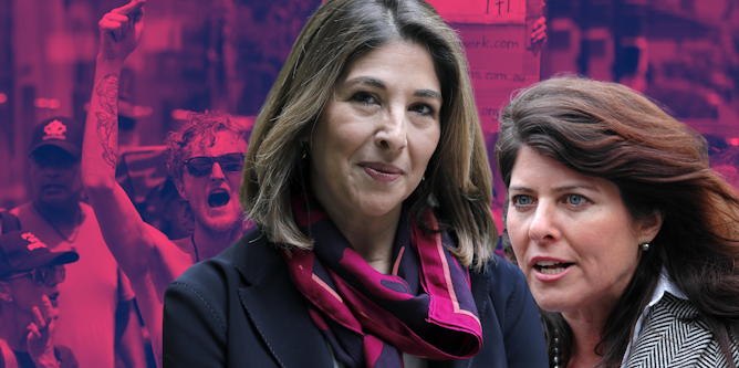 Naomi Klein (left), Naomi Wolf (right). Background protest Mick Tsikas/AP.
