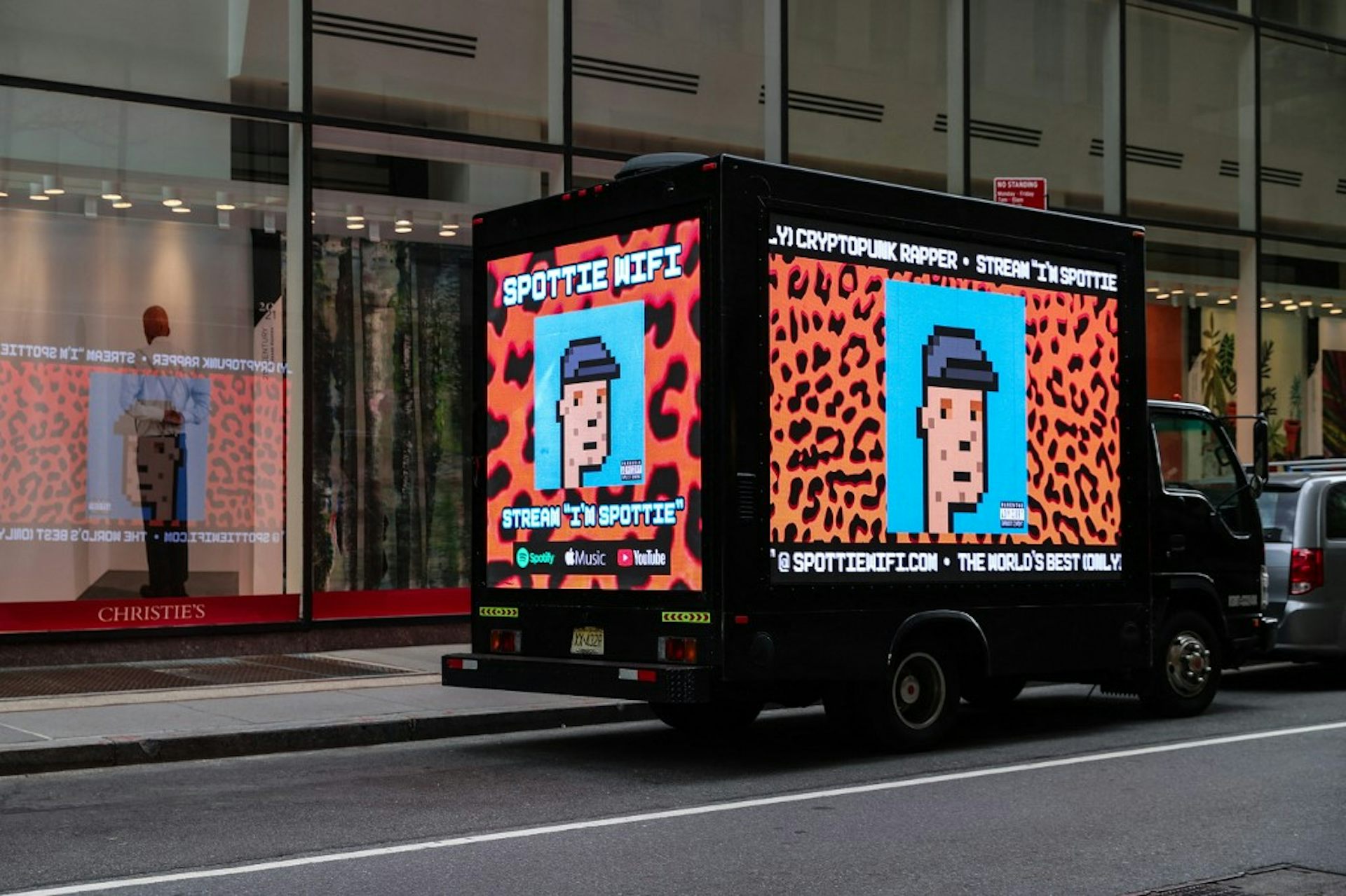 Un camion garé devant la maison de vente aux enchères Christie’s présente un jeton non fongible (NFT) d'art numérique CryptoPunk sur des panneaux d'affichage électroniques, le 11 mai 2021 à New York.