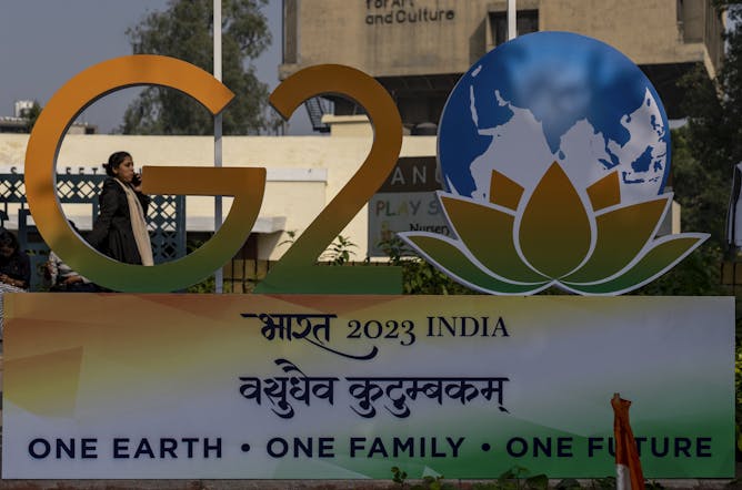 The 2023 G20 logo on display in New Delhi, India. By attending events in Kashmir, G20 delegates are tacitly condoning India’s colonial control of the region.