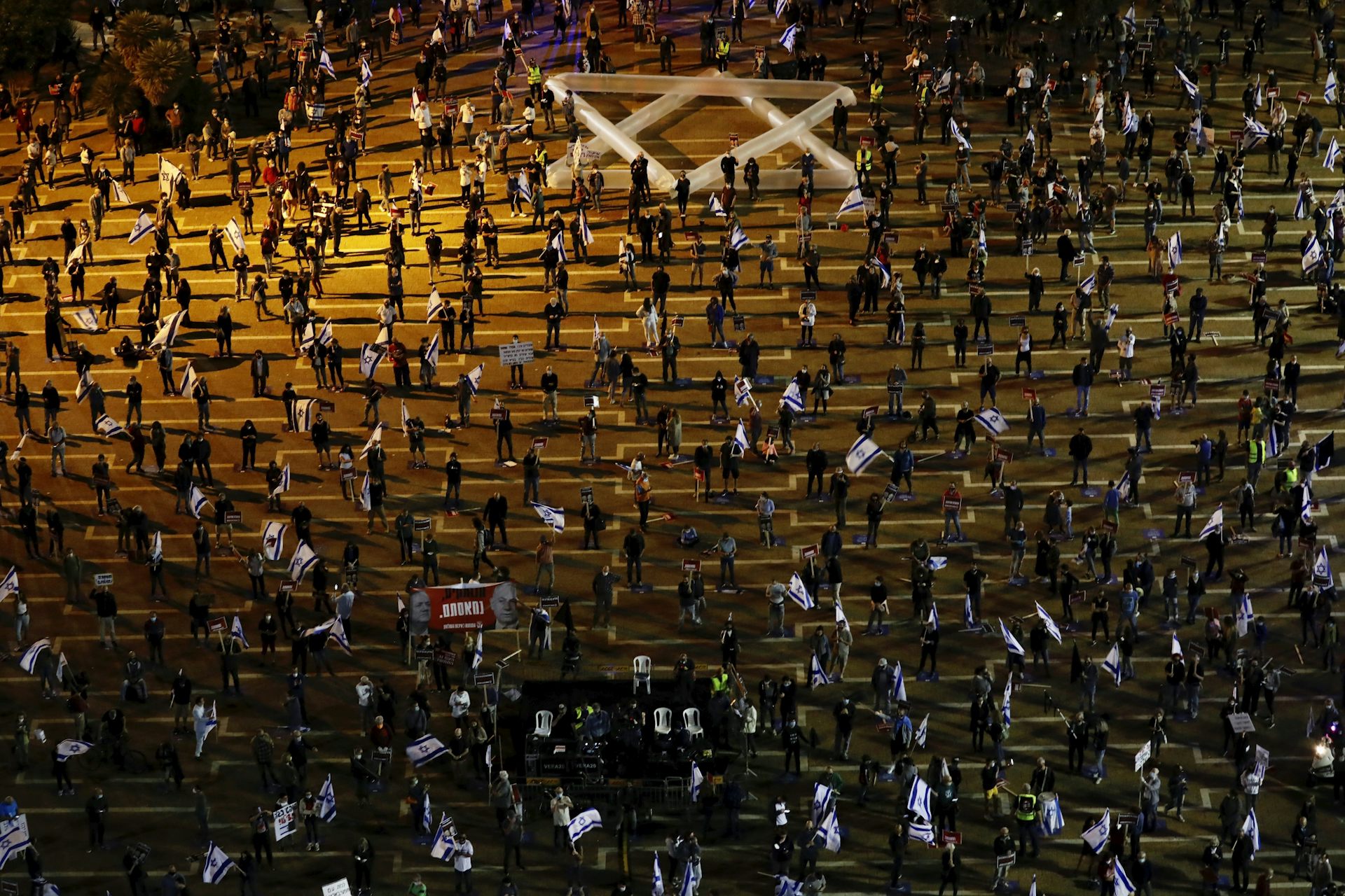 People keep social distance amid concerns over the coronavirus outbreak during a protest against the coalition deal between Prime Minister Benjamin Netanyahu and Benny Gantz and government corruption in Tel Aviv on May 2, 2020.