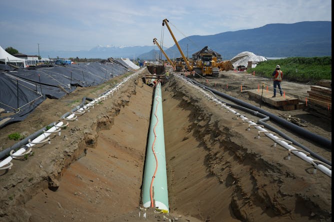 Workers lay pipe during construction of the Trans Mountain Pipeline expansion on farmland, in Abbotsford, B.C. in May 2023.
