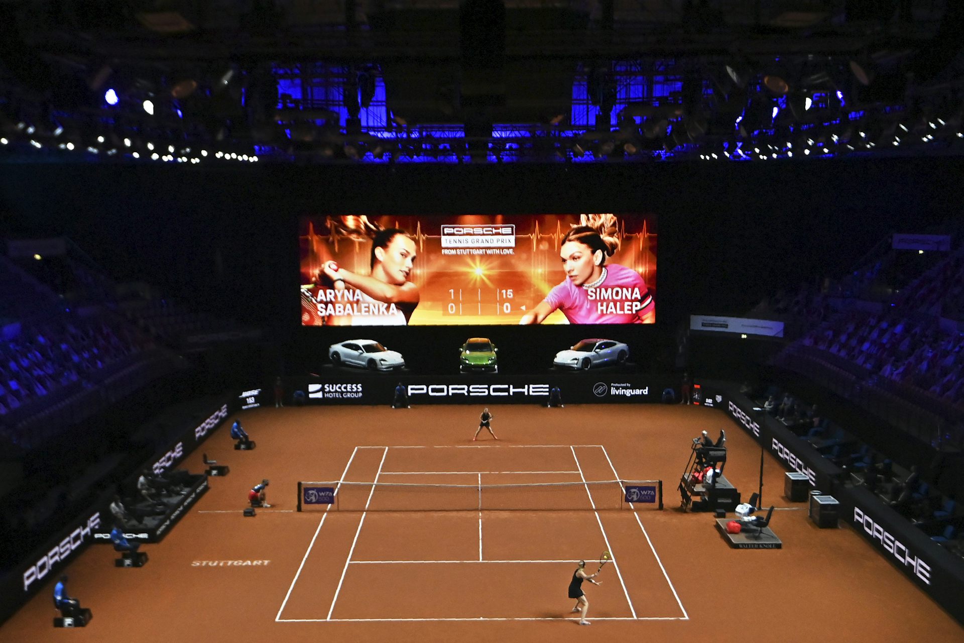 Aryna Sabalenka from Belarus returns the ball to Simona Halep of Romania during their semifinal tennis match of the women’s singles WTA Tour Porsche Grand Prix in Stuttgart, Germany in April 2021.