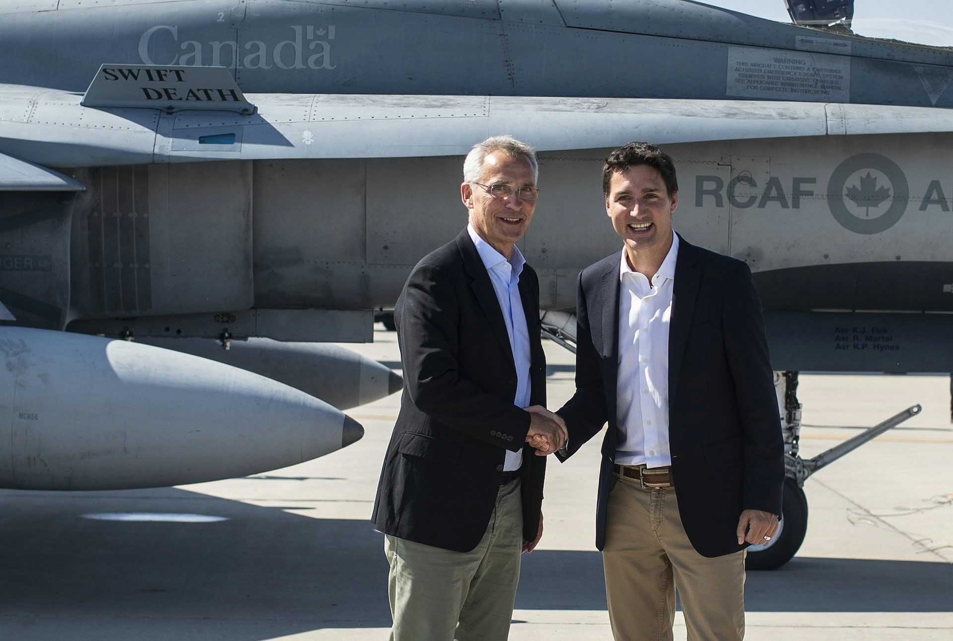 Le secrétaire général de l’OTAN, Jens Stoltenberg, et le premier ministre Justin Trudeau se font leurs adieux à la base aérienne de la 4e escadre de Cold Lake (Alberta), en août 2022, à l’issue d’une visite de M. Stoltenberg.