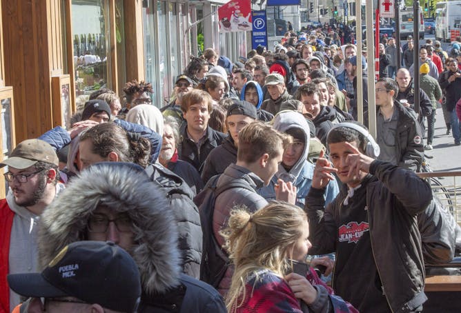 Hundreds of people line up at a government cannabis store on Oct. 17, 2018, in Montréal as the legal sale of cannabis begins in Canada.