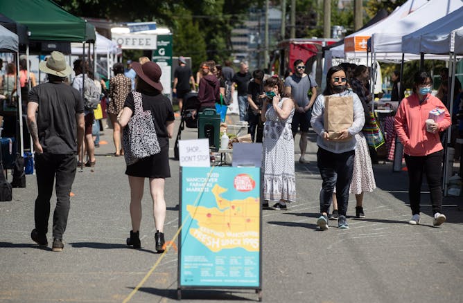 People are seen at the Mount Pleasant farmers market in Vancouver, B.C., where measures are in place to limit the number of people permitted at a time due to COVID-19.