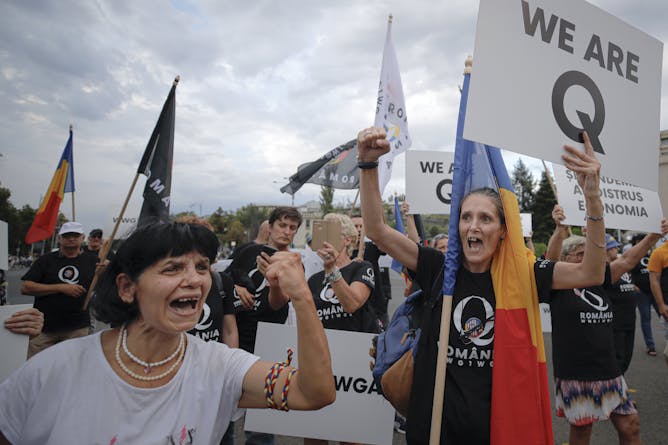 Des partisans du mouvement QAnon manifestent contre les mesures prises par le gouvernement roumain pour empêcher la propagation de la Covid-19, lors d'un rassemblement à Bucarest en août.