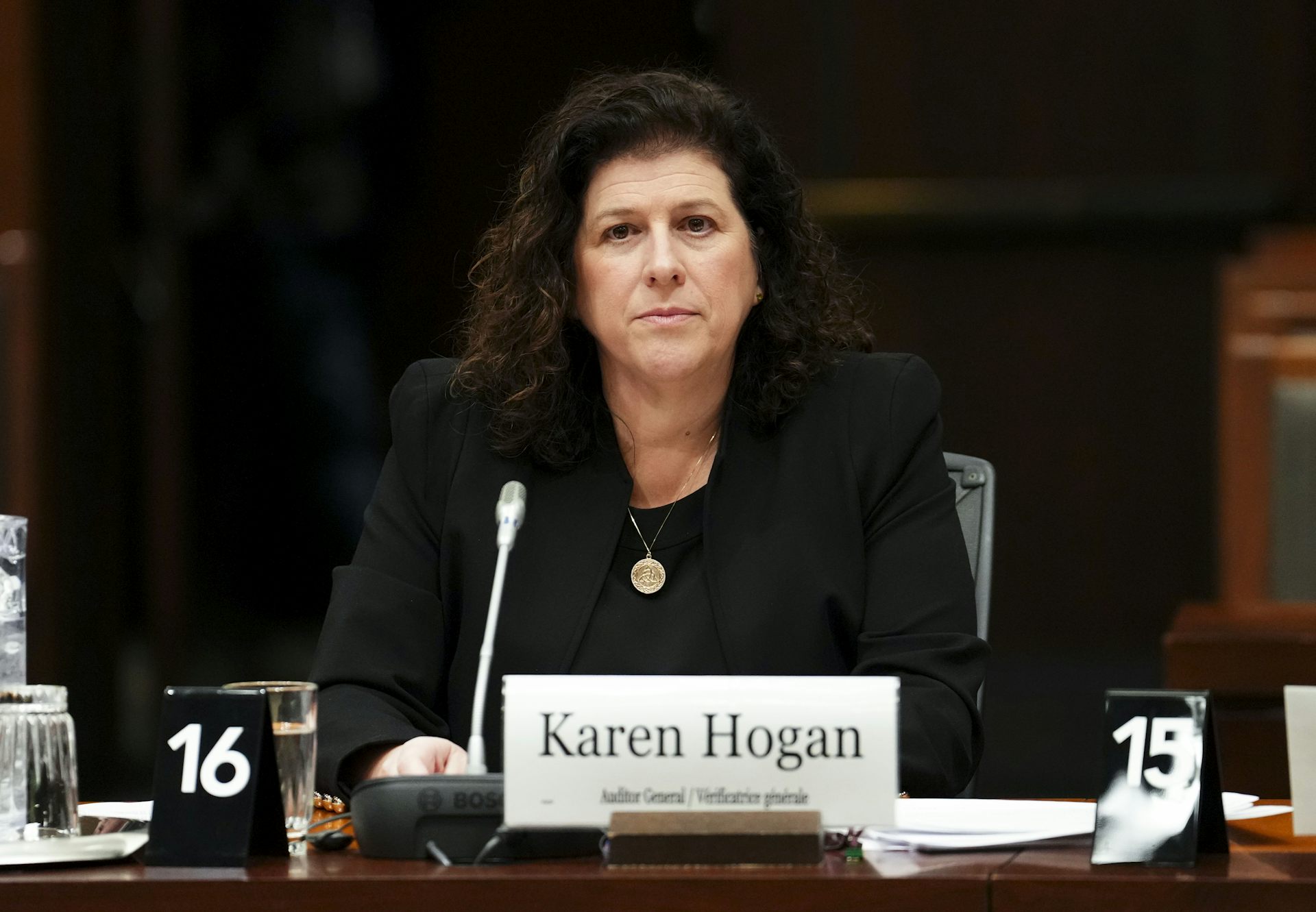 La vérificatrice générale Karen Hogan témoigne devant le comité permanent des comptes publics de la Chambre des communes, à Ottawa, le 12 février 2024. Elle est arrivée à des constats sévères quant à la gestion de l'application ArriveCan.
