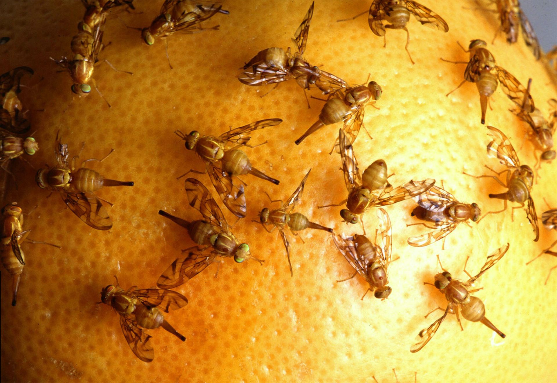 Moscas de la fruta mexicanas. Originaria de Guatemala y México, esta especie es invasora en California, donde es una carga para la agricultura del pomelo. Aquí, hembras poniendo sus huevos en una fruta.