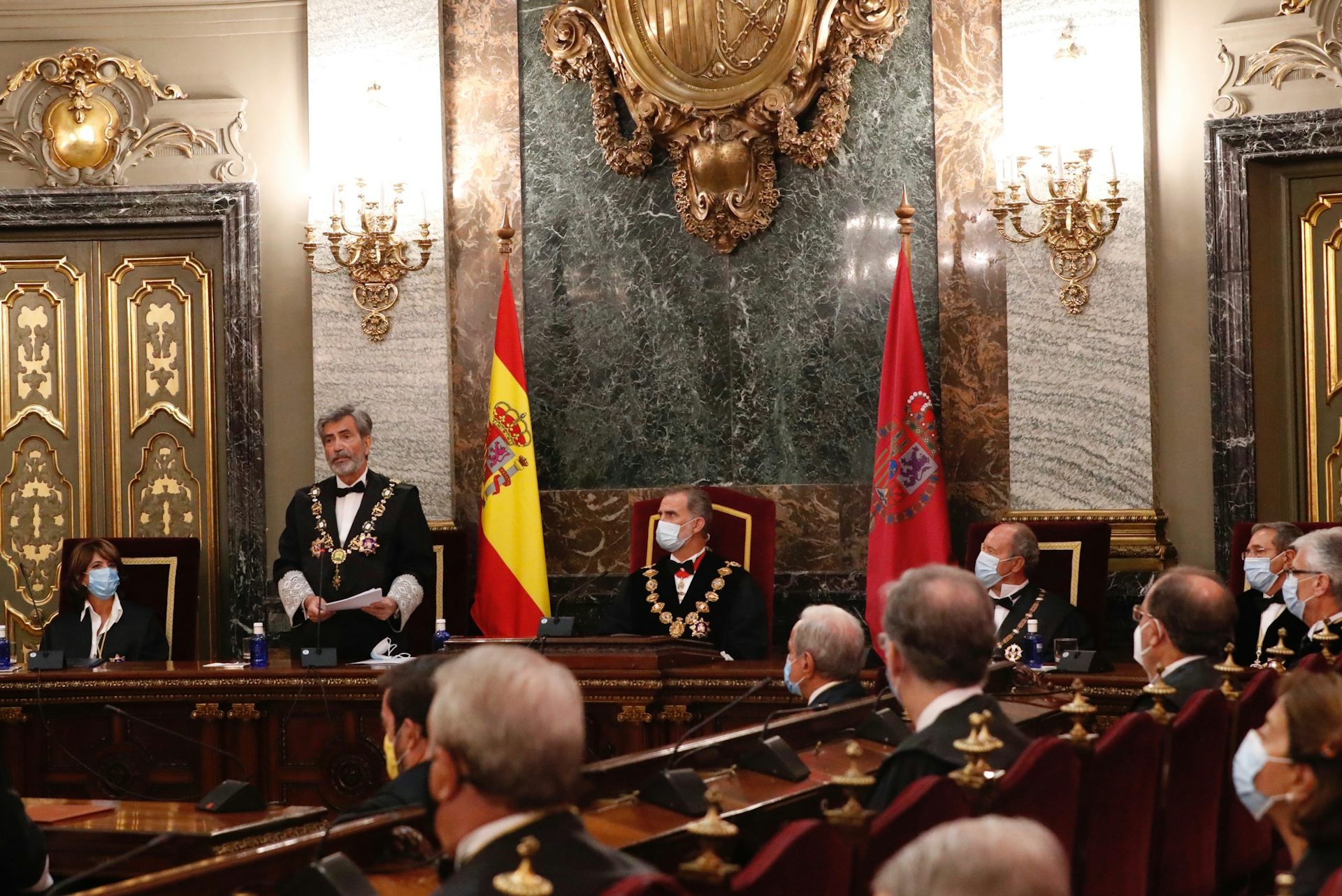 El rey de España, Felipe VI, y la ministra de Justicia, Dolores Delgado, escuchan al presidente del Consejo General del Poder Judicial y del Tribunal Supremo, Carlos Lesmes, durante el acto de apertura del año judicial 2021.