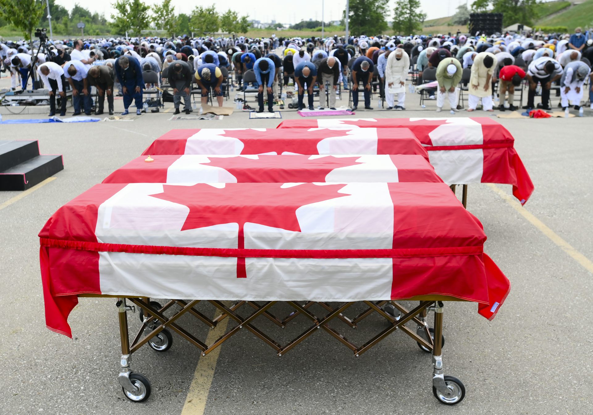 Thousands pray at the funeral service for the four victims of the deadly vehicle attack on members of the Canadian Muslim community in London, Ont., in June 2021. The man orginally charged with murder in the case had the charges upgraded to terrorism and was convicted.
