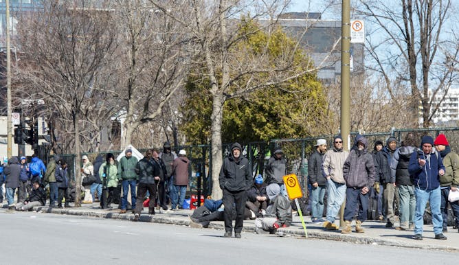 Des gens font la file devant un refuge pour sans-abri à Montréal, en mars 2020. Les problèmes sociaux sont de plus en plus complexes et pour les résoudre, il est nécessaire d’avoir recours à des solutions innovantes qui peuvent s’échelonner sur de très longues périodes.