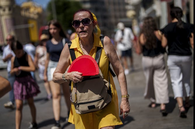 Une femme souffre de la chaleur extrême qui sévit à Madrid, en juillet 2023. Les enjeux de santé issus du changement climatique sont au coeur de la stratégie électorale des Verts, aux élections européennes 2024.