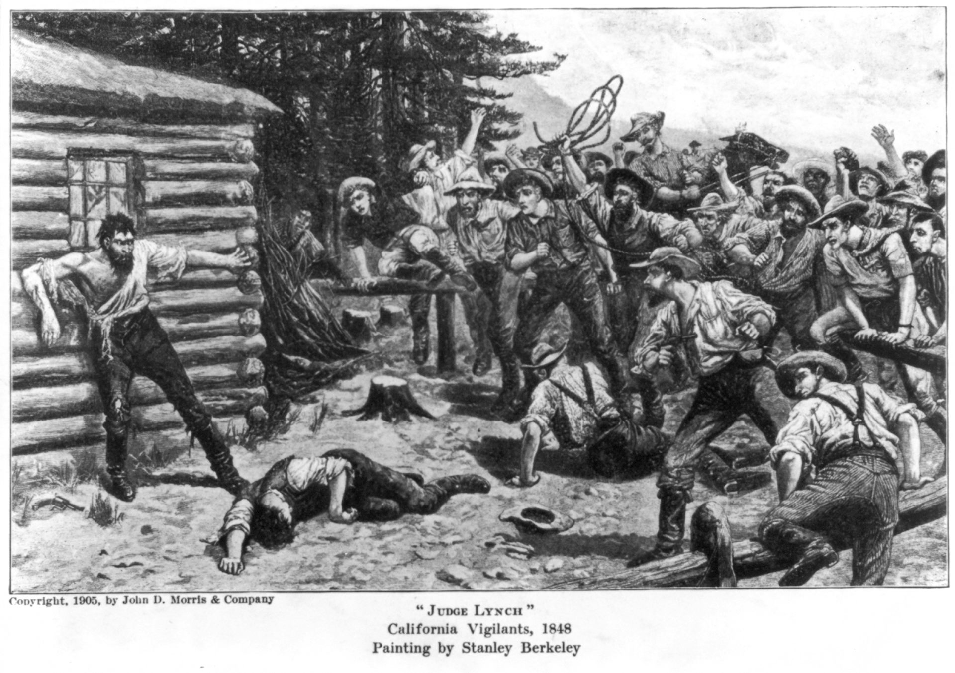 « Judge Lynch ». Reproduction en similigravure d'un tableau de Stanley Berkeley datant de 1905 et représentant le lynchage d'un marin accusé de vol par un groupe de vigilantes californiens en 1848.