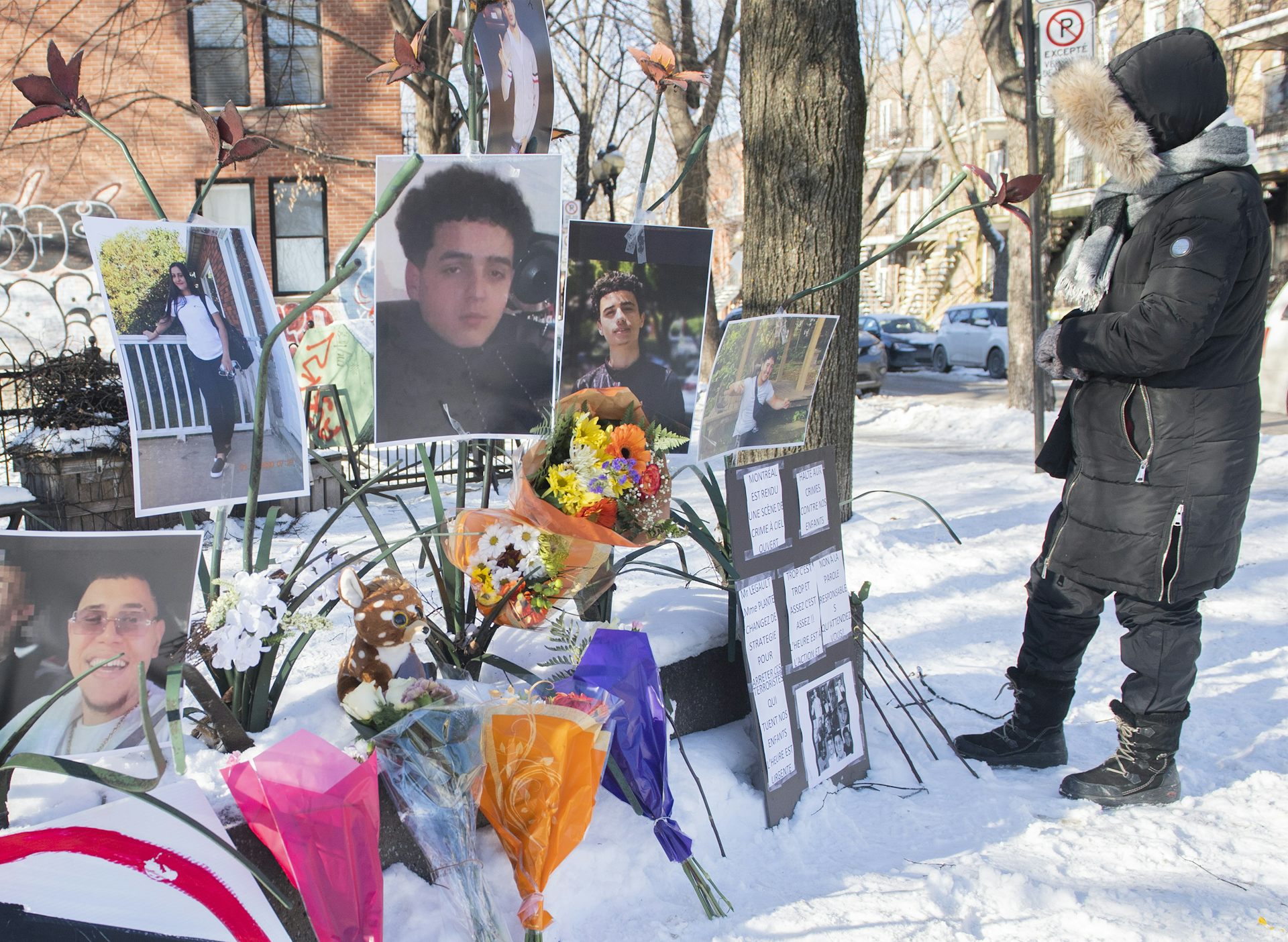 Un mémorial a été installé pour Amir Benayad, 17 ans, et d'autres victimes de fusillades, dont Meriem Boundaouia, près une veillée et une manifestation contre la violence armée à Montréal, le 16 janvier 2022.
