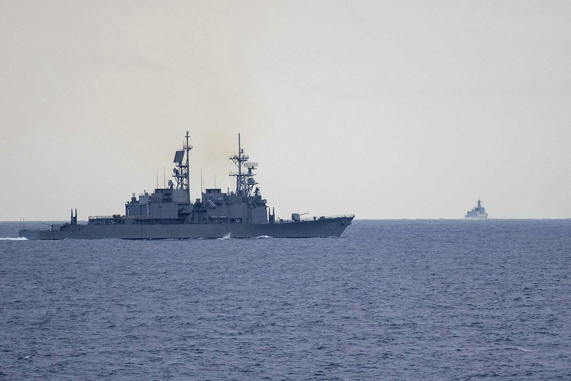 In this photo released by the Taiwan Ministry of National Defense, a Taiwanese guided missile destroyer, left, monitors a Chinese guided missile destroyer right, near Taiwan in May 2024 during the inauguration of Taiwan’s newly elected president.