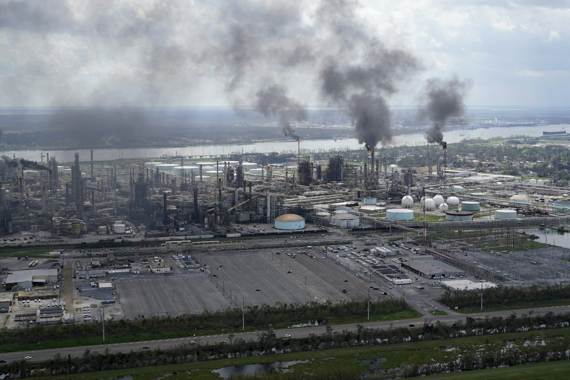 Flares burn at the Shell Norco Manufacturing Complex in 2021, in Norco, La. Plants like this produce not only greenhouse gas emissions, but also excess heat.