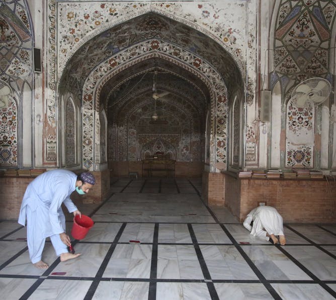 A man marks places in a mosque for worshippers to maintain distance during prayers after the government relaxed the weeks-long lockdown that was enforced to curb the spread of the coronavirus, in Peshawar, Pakistan.