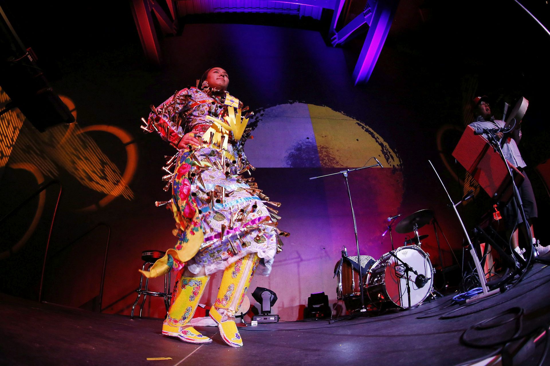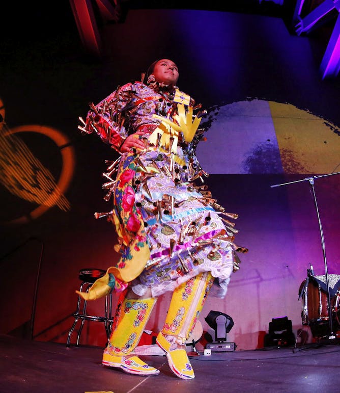 Kyla Henry, from Roseau River and Winnipeg, performs a Jingle Dress dance with Carson Robinson, from Sagkeeng First Nation, during a concert at the Canadian Museum for Human Rights in Winnipeg in June 2018.