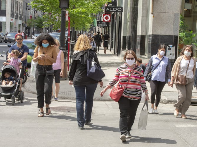 Les gens marchent sur la rue Sainte-Catherine, le 25 mai, à Montréal, alors que de nombreux commerces non essentiels ont été autorisés à rouvrir.
