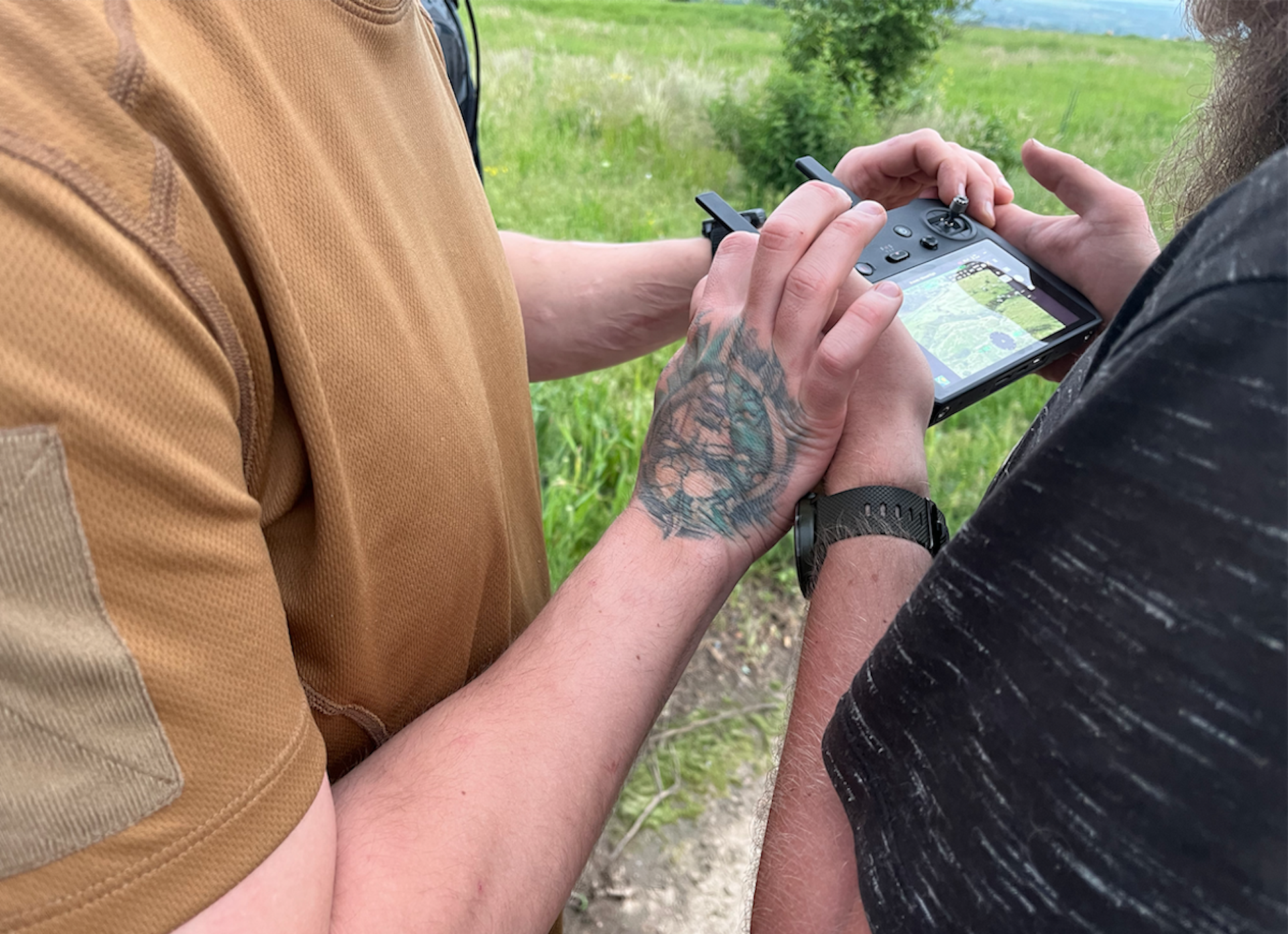 Deux combattants testent un nouveau drone qu’ils souhaitent utiliser à des fins de renseignement militaire, à quelques centaines de mètres des lignes russes.