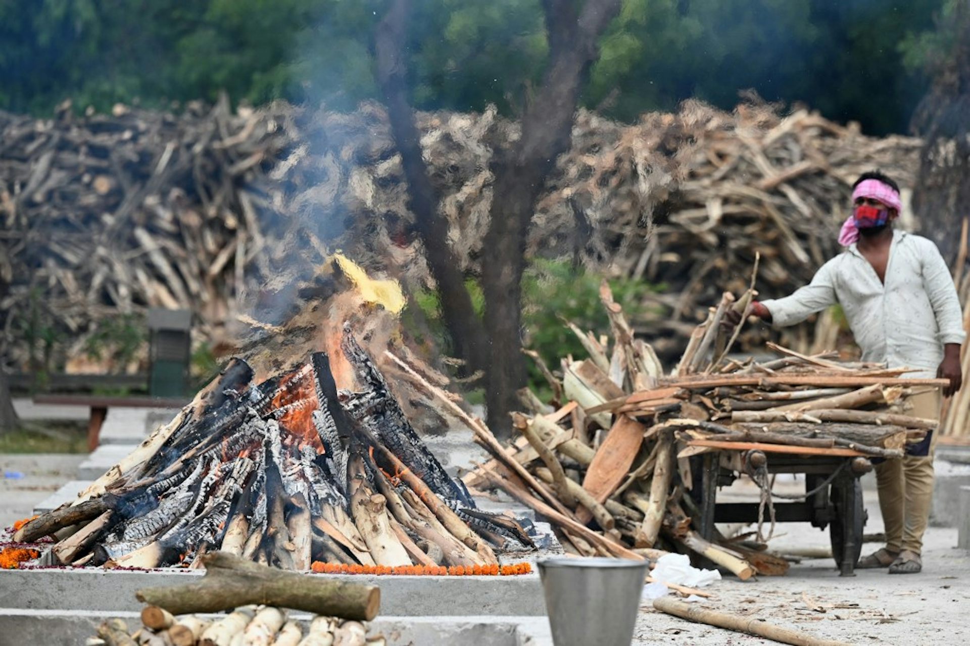 Préparation de bûchers funéraires pour des personnes décédées de la Covid-19 dans un cimetière à New Delhi, le 17 mai 2021.