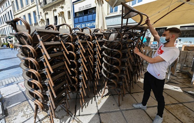 Agencement d'une terrasse le 17 mai 2021 à Montpellier en vue de la réouverture annoncée pour le 19 mai.