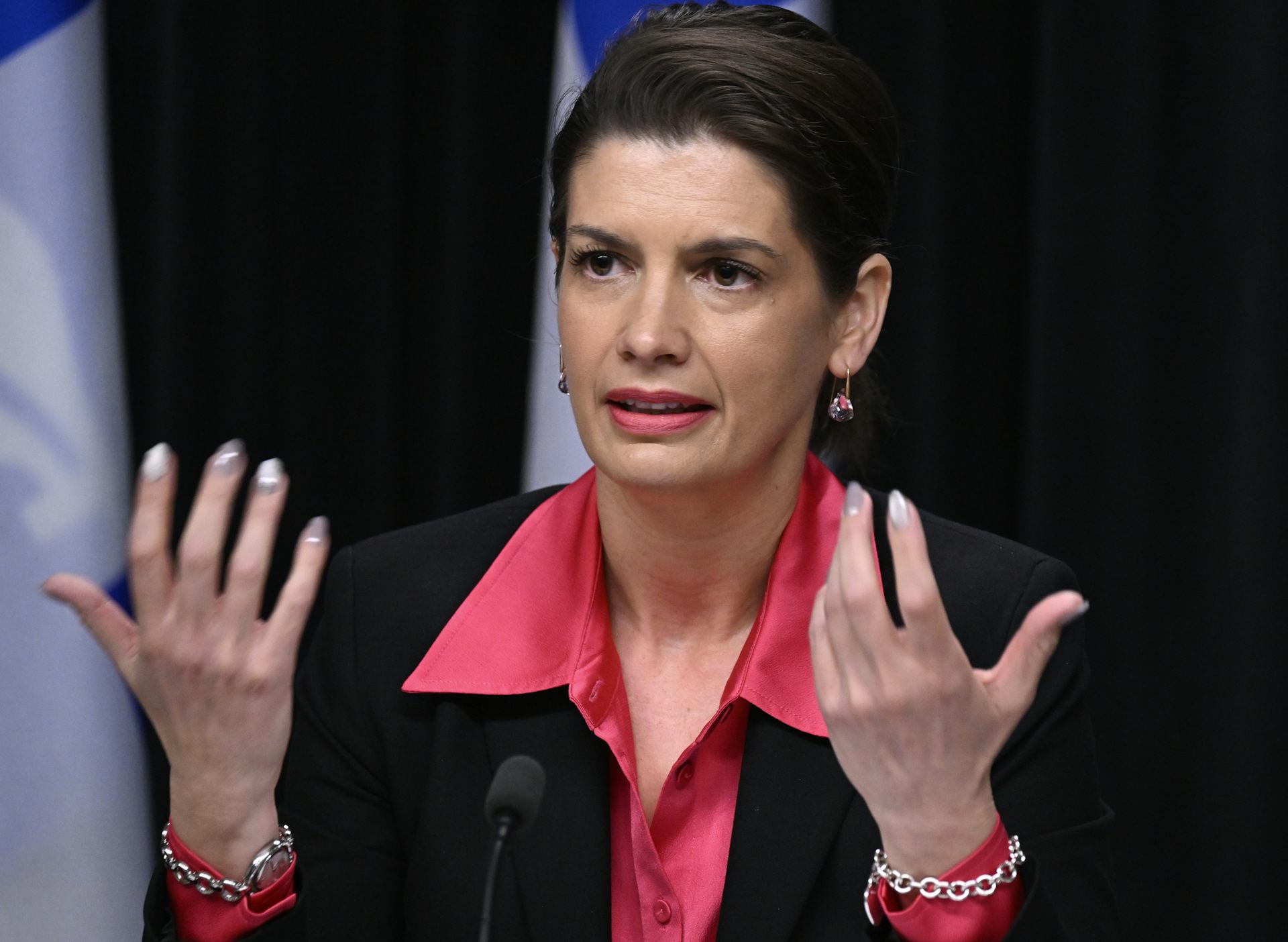 La ministre des Transports du Québec, Geneviève Guilbault, annonce que le gouvernement ne construira pas de troisième lien pour les voitures entre Lévis et Québec lors d'une conférence de presse, le 20 avril 2023 à Québec.