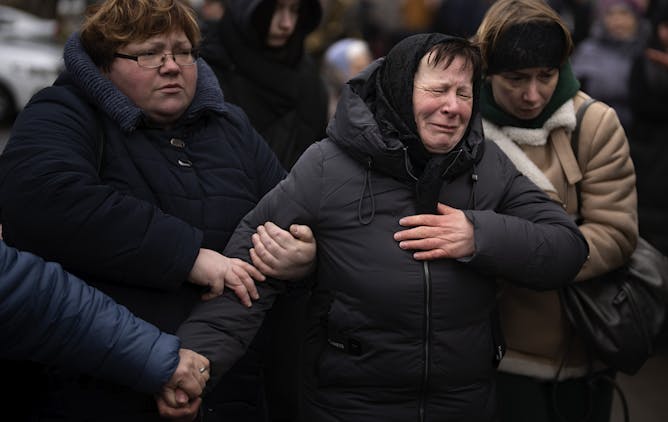 A Ukrainian mother sobs at the funeral of her son in Irpin, near Kyiv, on Feb. 14, 2023. He was a civilian who was a volunteer in the armed forces of Ukraine and died fighting in the Bakhmut area of the country.
