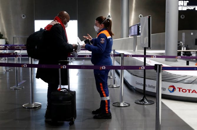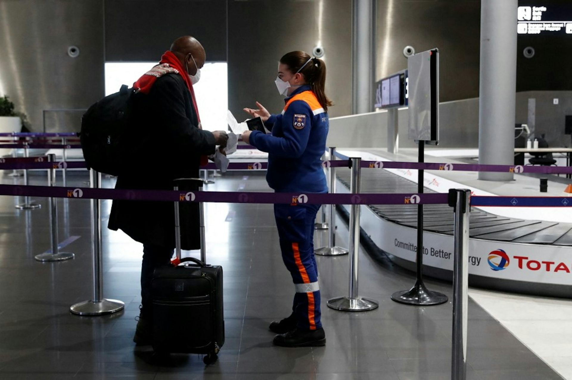Une membre des services civiques vérifie les documents - dont une attestation de test au Covid négatif - d'un passager au départ de l'aéroport Roissy-Charles de Gaulle le 5 février 2021.