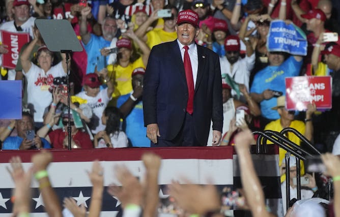 Former President Donald Trump reacts to the crowd after he finished speaking at a campaign rally in support of Sen. Marco Rubio in Miami in November.