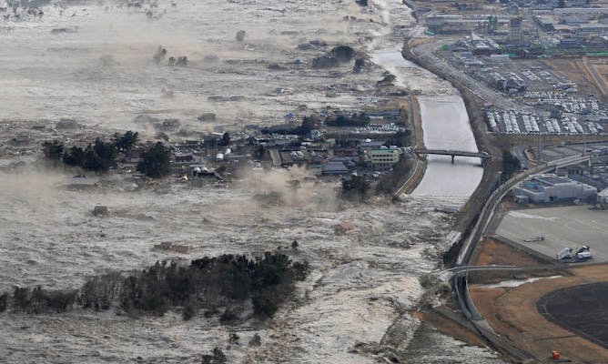 An earthquake-triggered tsunami sweeps shores along Iwanuma, Miyagi prefecture, northern Japan, March 11, 2011.