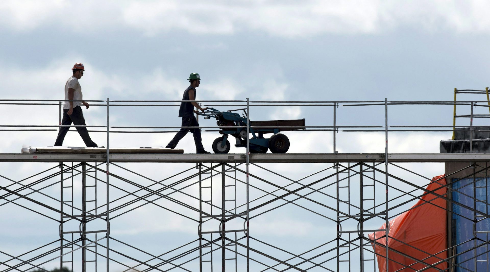 Des ouvriers traversent un haut échafaudage sur un chantier de construction. La crise actuelle fait ressortir l’importance des aspects sociaux et environnementaux liés à tout grand projet d’infrastructures.