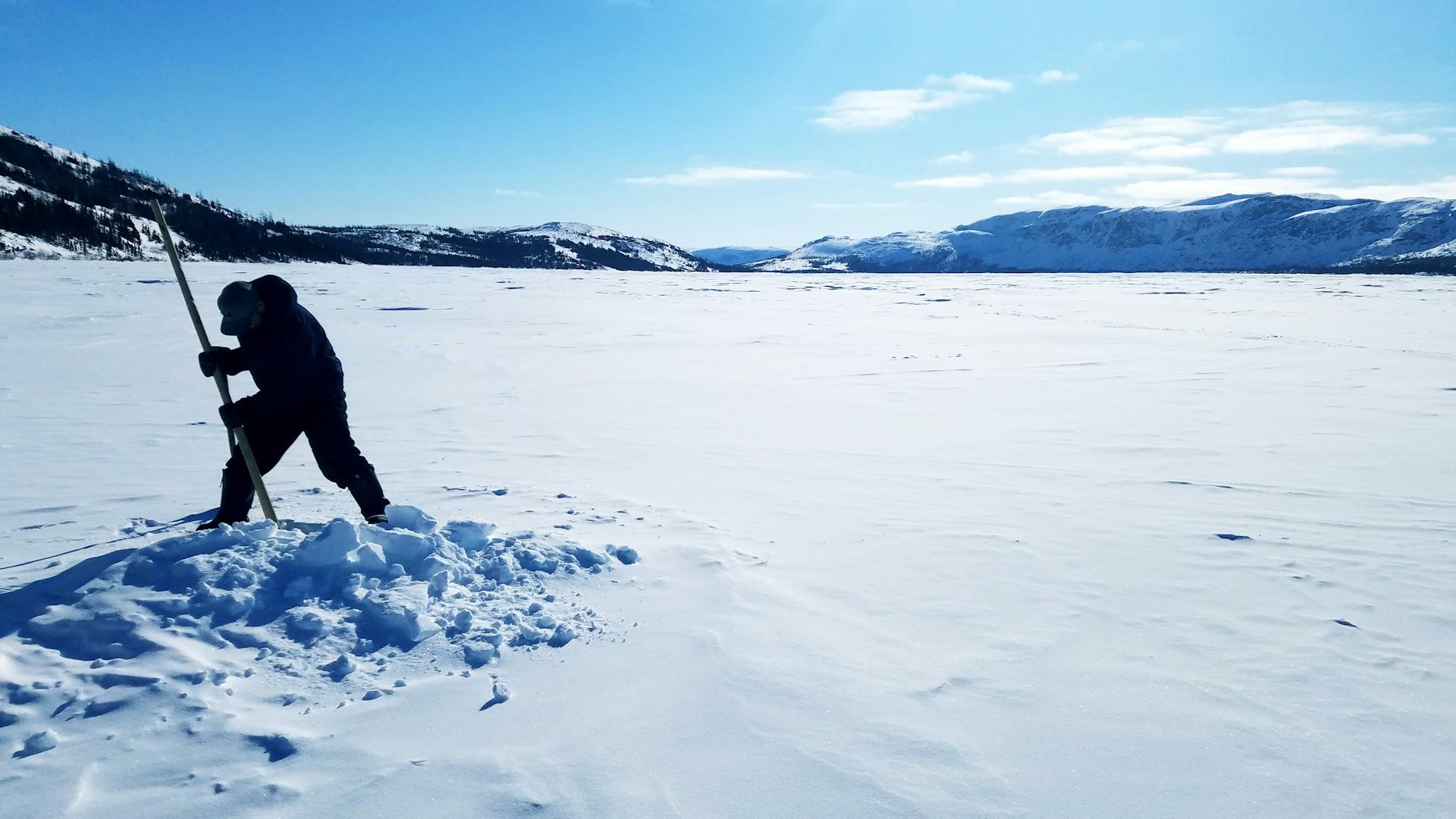 Un pêcheur inuit creuse la glace de façon traditionnelle afin d'installer ses filets.